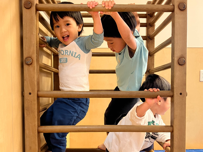 また、屋内にはプレイルームを設けており、肋木遊びやマット運動など、天候に左右されずに体を動かせる環境を整えています。