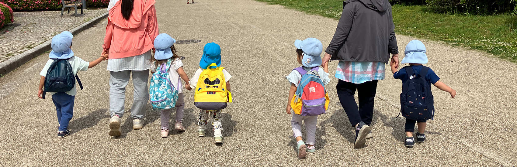 毎日のお散歩では、たっぷり体を動かしながら自然とふれあい、五感を育んでいます。