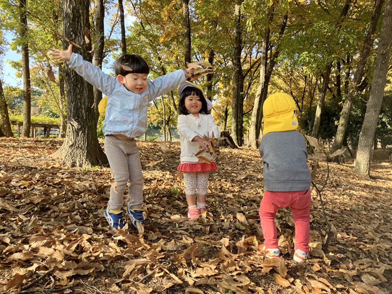 秋には落ち葉やどんぐりを拾ったり、小鳥のさえずりに耳をすませたりしながら、ゆったりとした保育を行っています。